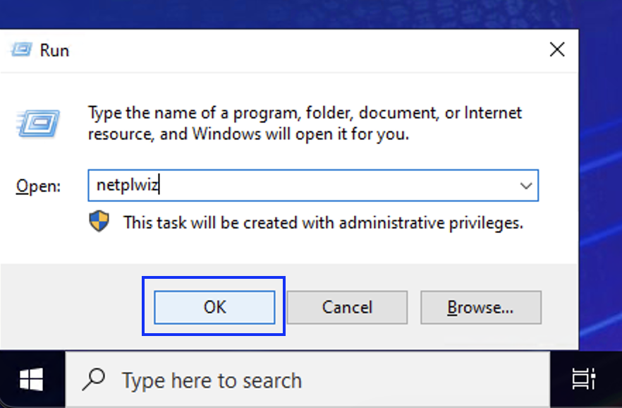 Type “netplwiz” and press ok