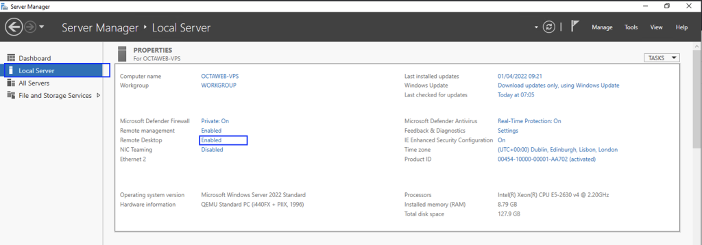 Click on Local Server and find ‘Remote Desktop’, Click on ‘Enabled’ next to it