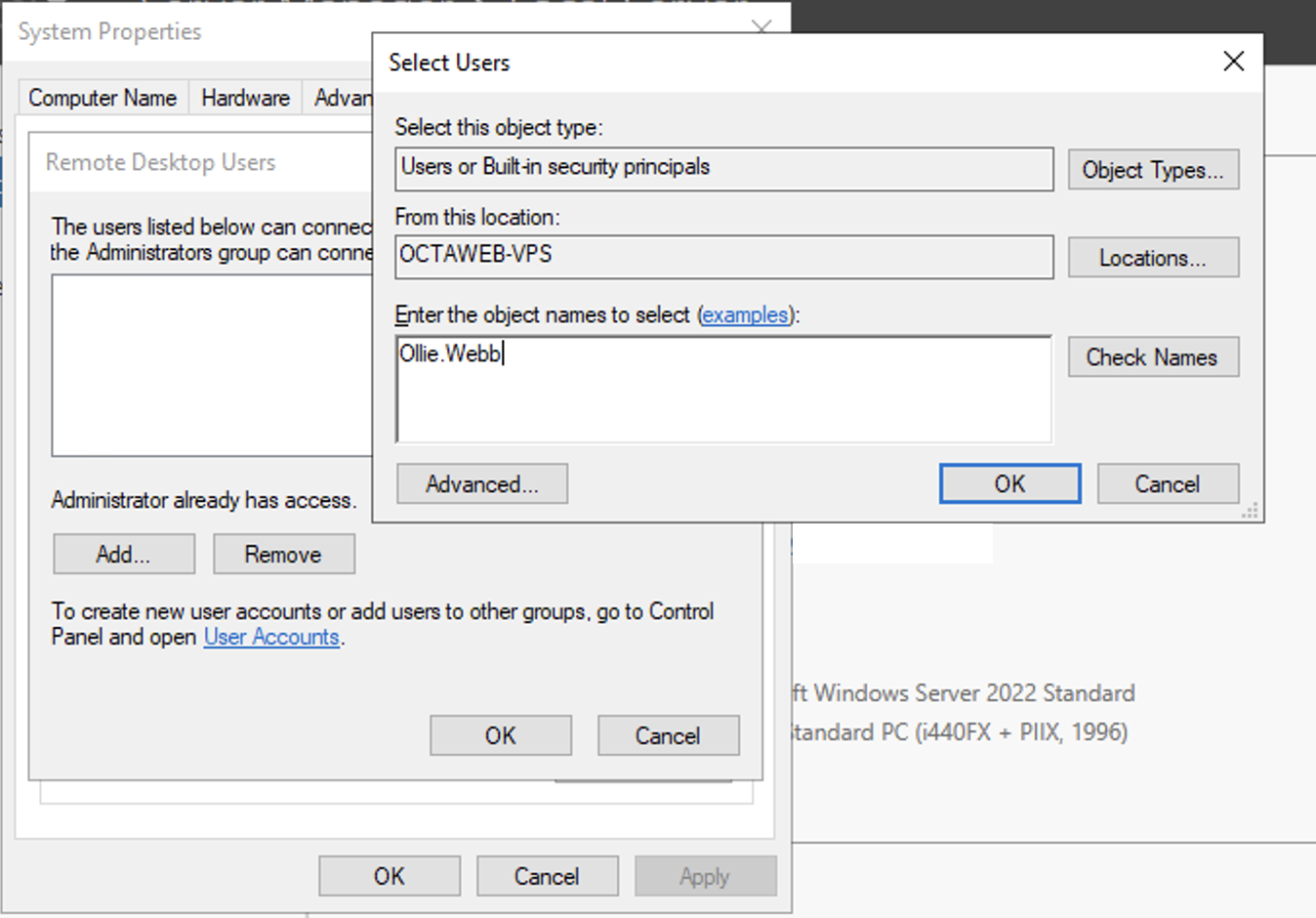 Type in the Username of the User you created (in this case ‘Example’) and press ‘OK’ until you’re back on the System Properties page. Press ‘Apply’, then ‘OK’ to close it down.