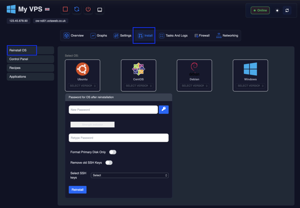 From this page select your operating system and input the VPS Password.