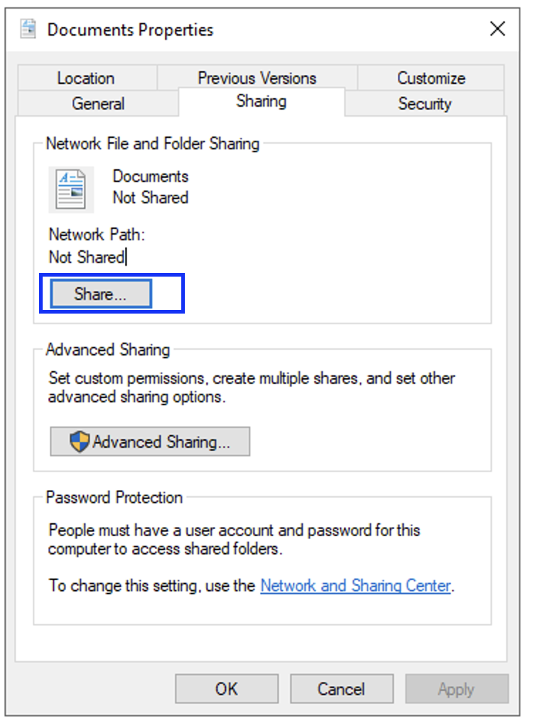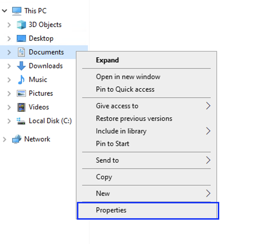 Find the folder you want to share, in this example it’s ‘Documents’, then right click and click ‘Properties’.